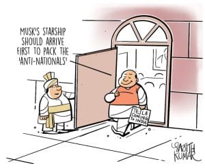 Here, Sajith Kumar gives a satirical take on the recent Musk-Modi meet, in which the Tesla CEO praised the PM and was hopeful of Tesla’s entry into the Indian market.