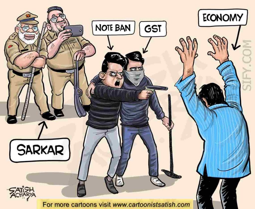 Satish Acharya illustrates the two important events of the week — Union Budget for the ailing economy and the shooting at Jamia Millia Islamia.