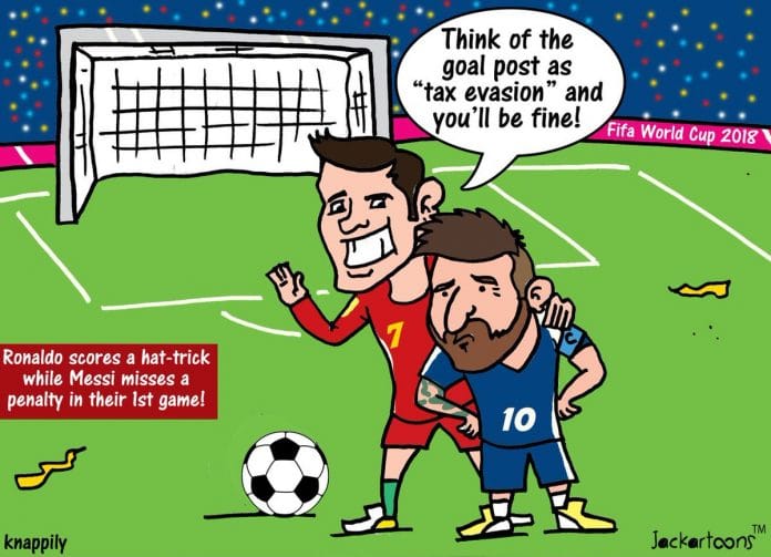 Cartoonist Sanket Jack pokes fun at Lionel Messi for failing to score a single penalty goal at the World Cup, while Christiano Ronaldo scored three. Both the football stars have been convicted of tax fraud.