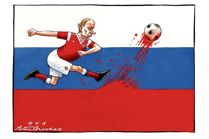 Peter Brookes in The Times depicts the FIFA World Cup kicking off in Russia amid protests against the Putin government for helping Syria’s Assad regime and its aggression in Ukraine. Many have described World Cup 2018 as being politically charged.