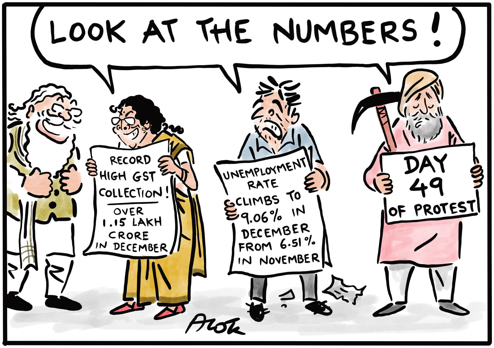 Alok Nirantar notes how the government is focusing on one set of data — the record GDP collection in December — while wilfully ignoring other numbers, including soaring unemployment in the country and almost 50 days of protests by farmers.