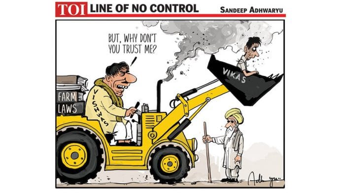 In today’s featured cartoon, Sandeep Adhwaryu draws on the Modi government’s ‘sabka vikas, sabka vishwas’ slogan to comment on the government’s stance vis-a-vis the farmers’ protests.