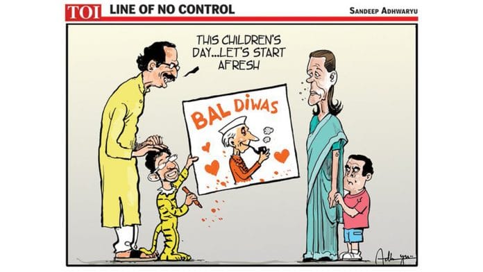 In today’s featured cartoon, Sandeep Adhwaryu celebrates Pandit Jawaharlal Nehru’s birthday and Children’s Day by poking fun at the possible Congress-Shiv Sena alliance in Maharashtra.