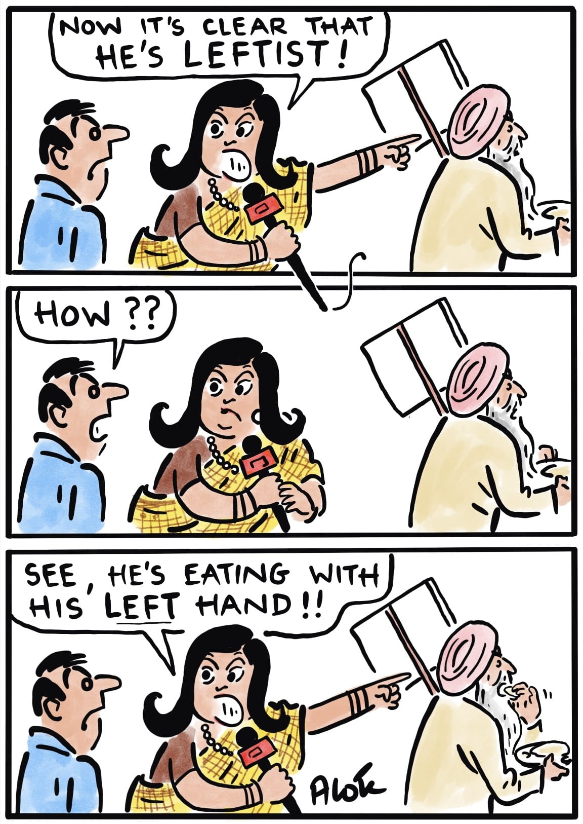 Alok Nirantar pokes fun at television news channels alleging that a pro-Left wing lobby has hijacked the farmers’ protests.