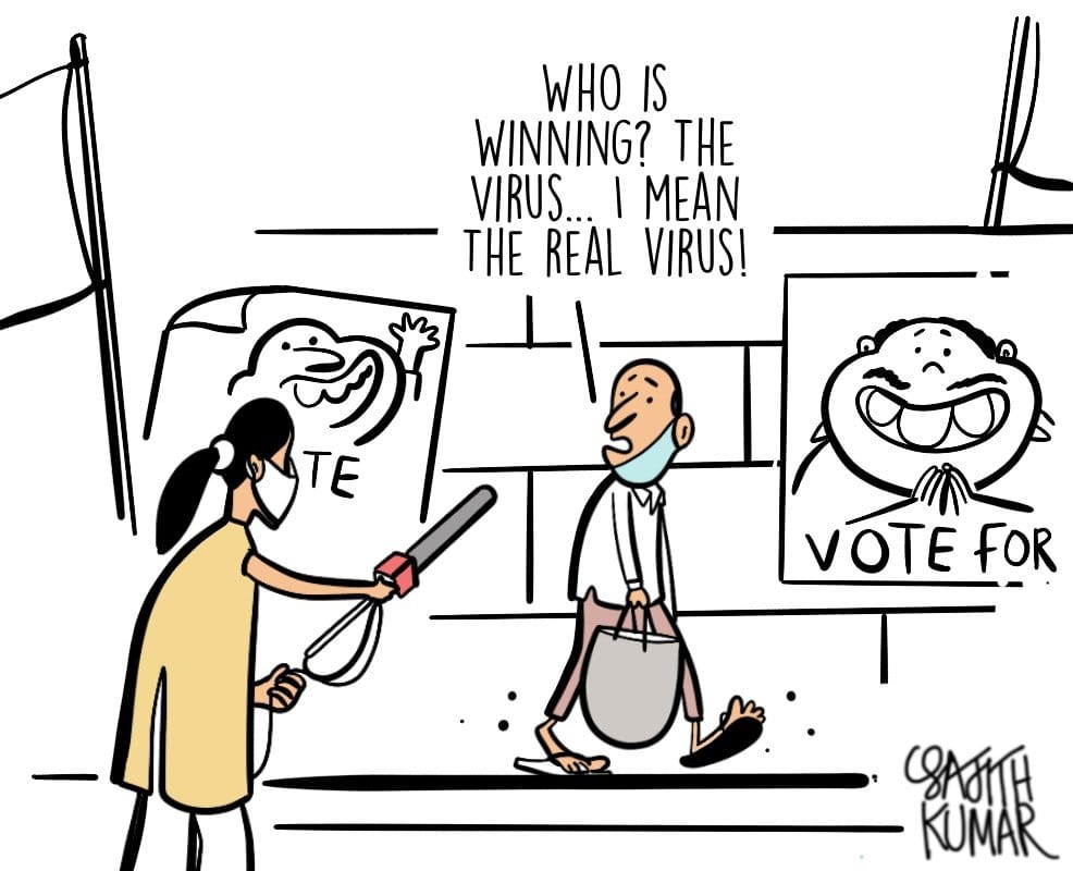 Sajith Kumar illustrates on how political parties and people are flouting Covid rules at election rallies.