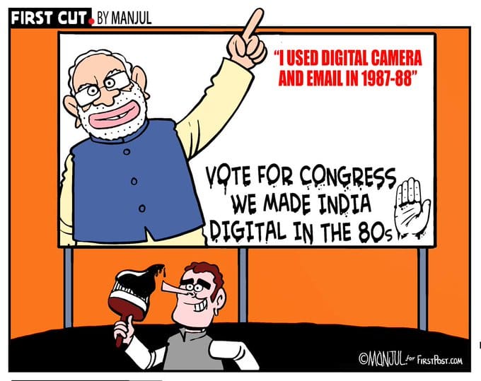 Manjul for Firstpost takes a dig at another of Prime Minister Narendra Modi’s faux pas from the TV interview to News Nation, in which he claimed to have used a digital camera and email in 1988. The claim, Manjul suggests, should only help the Congress’ election campaign as it suggests that India was made ‘digital’ as early as 1980s.