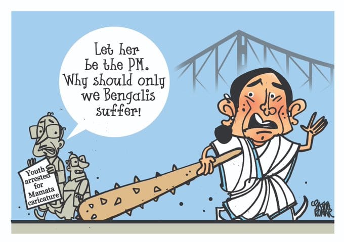 In today’s featured cartoon, Sandeep Adhwaryu for The Times of India takes a potshot at West Bengal Chief Minister Mamata Banerjee after her administration jailed Priyanka Sharma, a BJP worker, for sharing a meme of the chief minister. The Supreme Court granted Sharma bail Tuesday but has asked her to apologise to Bannerjee, sparking another controversy.