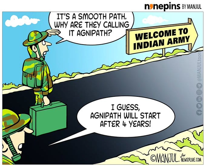 Manjul takes a jibe at the newly announced ‘Agnipath‘ (‘path of fire’) recruitment scheme for the armed forces, which will involve recruiting soldiers for four years and retaining only 25 per cent of them after this period as career servicemen — which has led to criticism and mass protests over the future prospects of the discharged ‘Agniveers’.