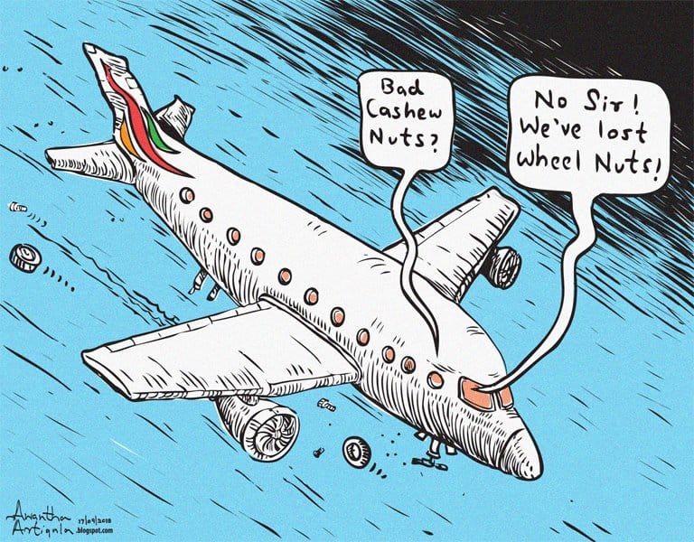 Cartoonist Awantha Artigala on the decision by Sri Lanka’s national airline to stop serving cashew nuts on board, after the country’s President, Maithripala Sirisena, angry over the quality of cashew nuts served to him on a flight from Kathmandu, exclaimed that even dogs wouldn’t eat them.