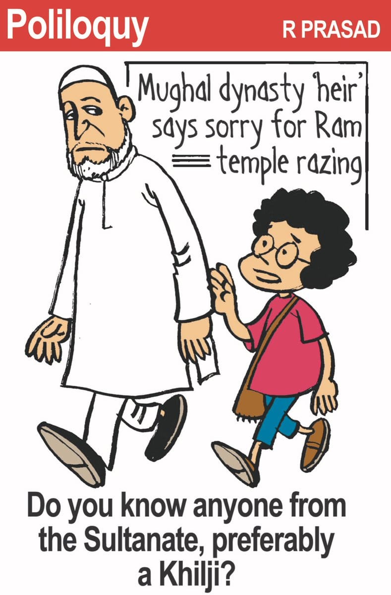 In The Economic Times, R. Prasad takes a jibe at the self-proclaimed heir to the Mughal dynasty, Yakub Habeebuddin Tucy, apologising to the Hindu community for the “destruction of Ram Temple in Ayodhya”.