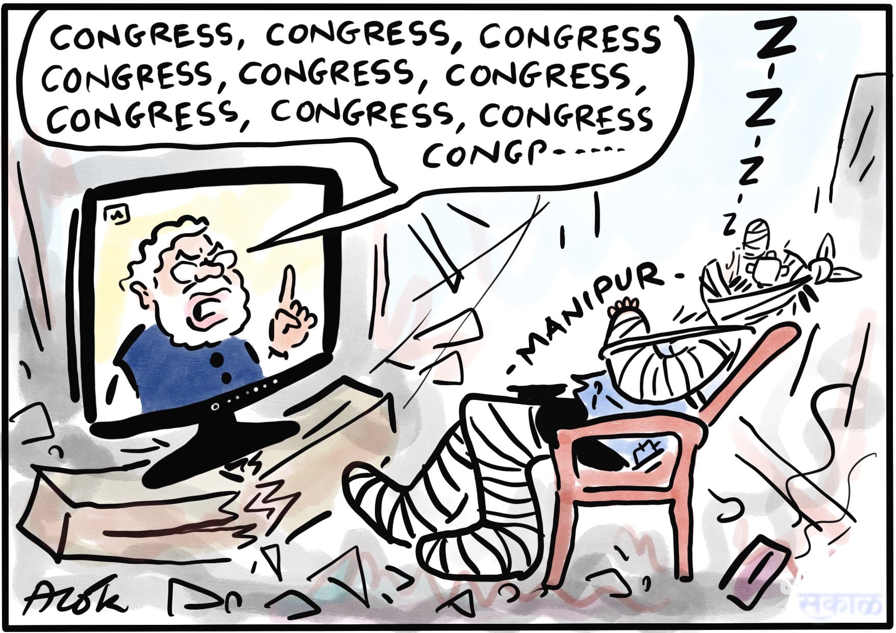 Here, Alok Nirantar alludes to Prime Minister Narendra Modi’s ‘inefficiency’ in acting on the Manipur crisis. The illustration depicts him blaming the opposition rather than fixing the issue at hand.