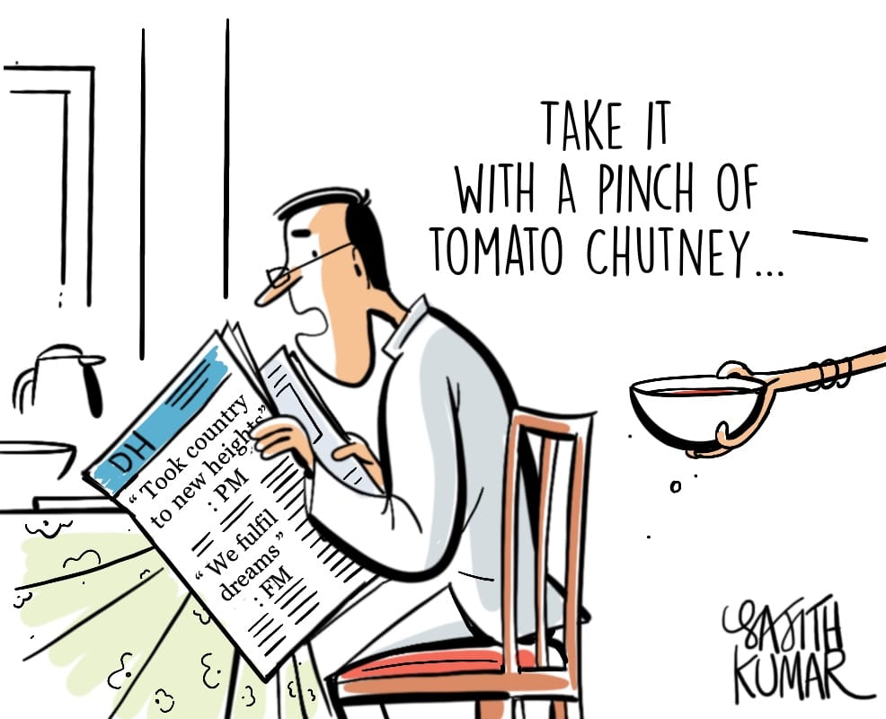 Through this cartoon, Sajith Kumar gives a satirical take on the recent hike in the price of tomatoes. While the political leaders are boasting of growth in India’s economy, the common man still suffers.