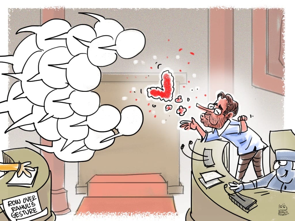 Mika Aziz, in his latest cartoon, brings up the accusation by Union Minister Smriti Irani against Congress MP Rahul Gandhi. The Union Minister has claimed that Gandhi blew a kiss before walking out of the Lok Sabha. She claimed this behaviour to be ‘misogynistic’.