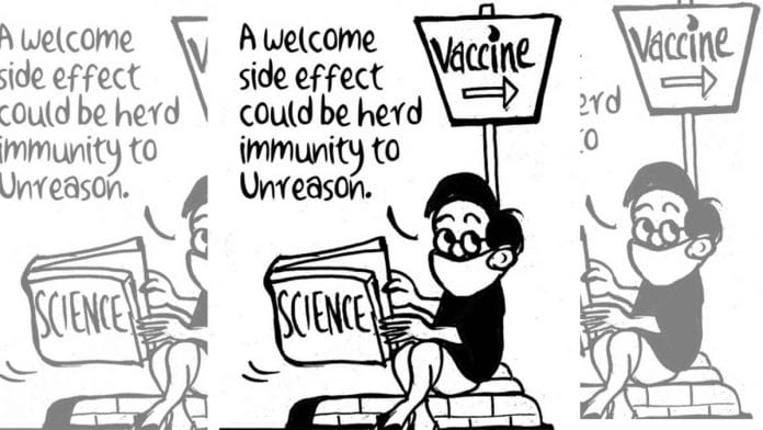 In today’s featured cartoon, E.P. Unny notes how the intense discussions around the Covid vaccine may just propel the Indian population out of the domain of ‘unreason’.