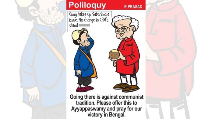 In today’s featured cartoon, R. Prasad illustrates the continued prevalance of the Sabarimala temple controversy between the CPI(M) and the Congress, ahead of the Kerala assembly elections.