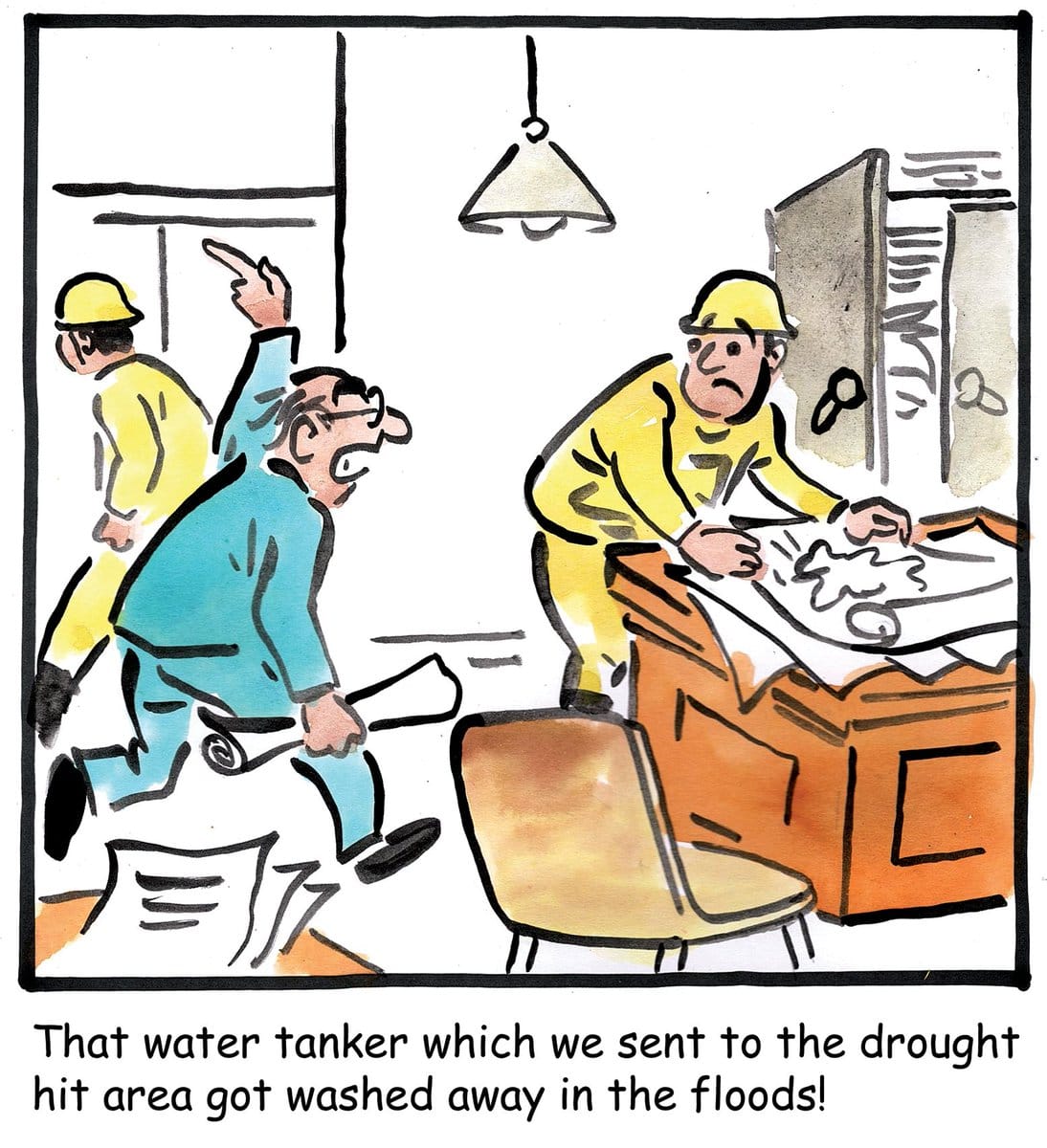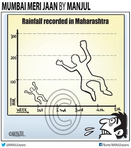 Alok Nirantar caricatures how Mumbai has been reeling under floods while several parts of the country is battling water crisis.