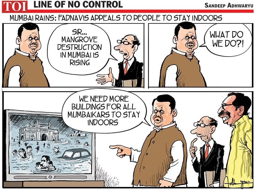 Sandeep Adhwaryu for The Times of India takes a dig at Maharashtra Chief Minister Devendra Fadnavis’ advice to Mumbai residents of staying indoors as the city gets flooded with record rainfall. Cartoonist also highlights threat to the state’s Mangrove vegetation due to the high-speed bullet train corridor project