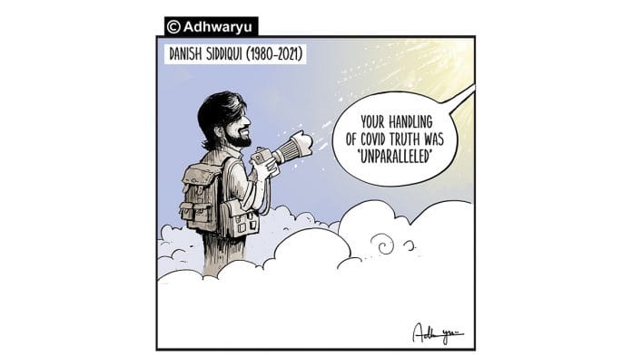 In today’s featured cartoon, Sandeep Adhwaryu draws on Pulitzer Prize-winning Reuters photojournalist Danish Siddiqui who was killed while covering clashes between Afghan security forces and the Taliban in Spin Boldak district in Kandahar.