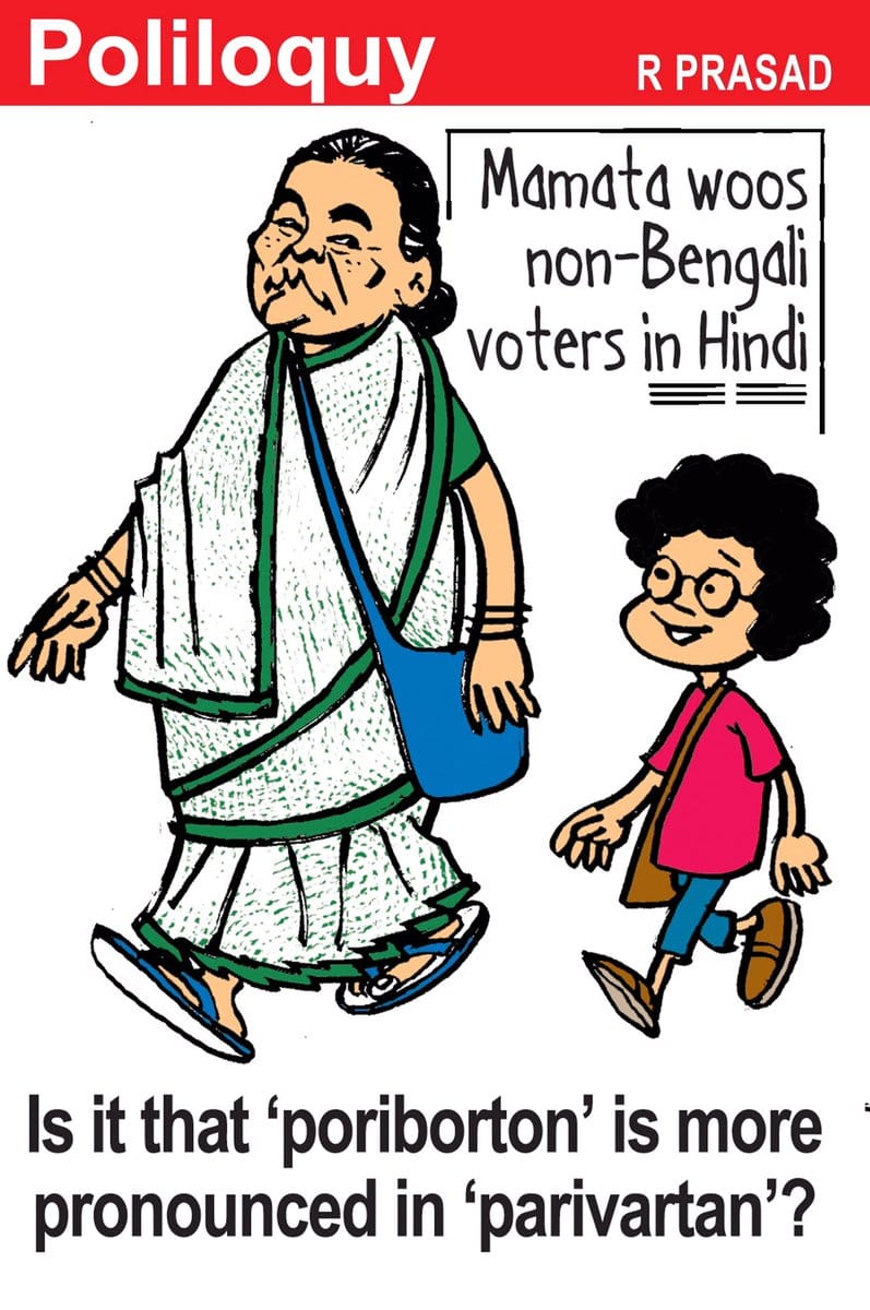 In The Economic Times, R. Prasad comments on West Bengal CM Mamata Banerjee’s wooing of non-Bengali crowd in Hindi at a business meet in Purulia Tuesday. The cartoonist sarcastically suggests that if ‘poribarton‘ (change) is pronounced as ‘parivartan’, it will have a greater impact.