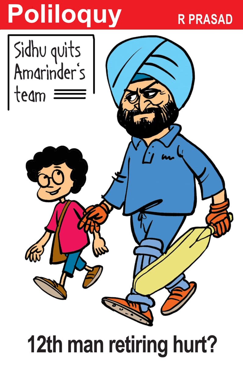 R Prasad depicts cricketer-turned-politician Navjot Singh Sidhu’s resignation from the Congress party, leaving Punjab Chief Minister Captain Amarinder Singh to fend for himself.