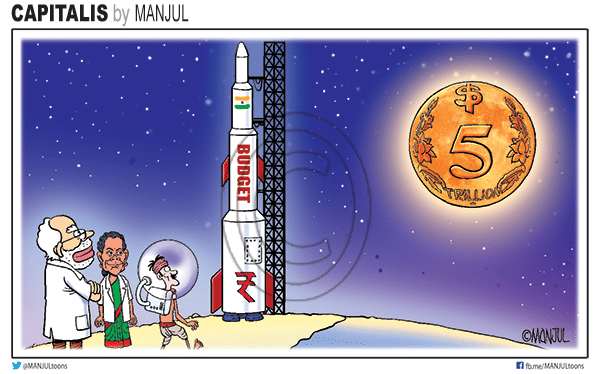 Manjul pokes fun at the Modi government’s outlandish claim of making India a $5 trillion economy by 2024 according to the 2019 budget. The cartoonist alludes to the launch of ISRO’s Chandrayaan-2, India’s second moon mission after 2008.
