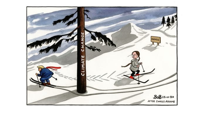 In today’s featured cartoon, the cartoonist depicts US President Donald Trump’s ignorance about climate change. His speech about “optimism” at the World Economic Forum summit in Davos stood in stark contrast to the arguments put forth by Greta Thunberg, the Swedish teenager who has emerged as one of the most important voices on the crisis facing the world.