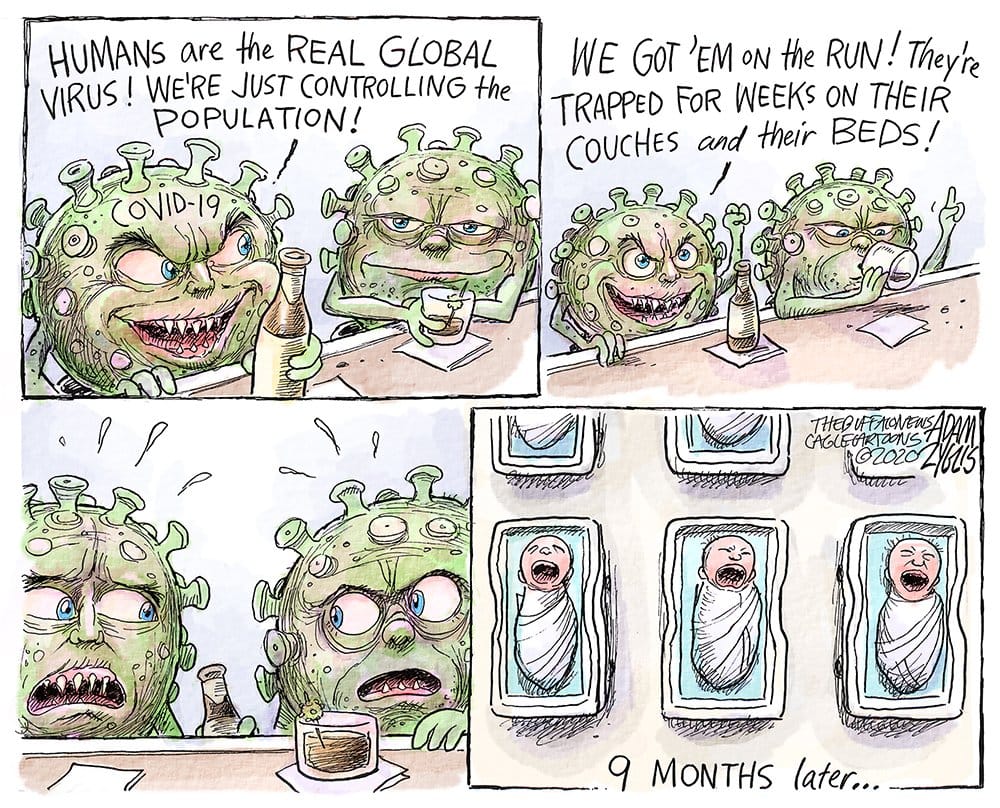 Adam Zyglis personifies the novel coronavirus to suggest that with more couples self-quarantining at home, the number of babies born can potentially rise.