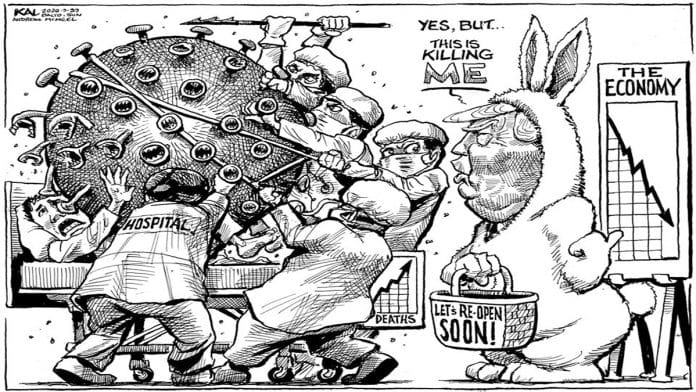 In today’s featured cartoon, Kevin Kallaugher pokes fun at US President Donald Trump’s announcement Friday that coronavirus restrictions in the country will be eased in time for the Easter holiday on 12 April.