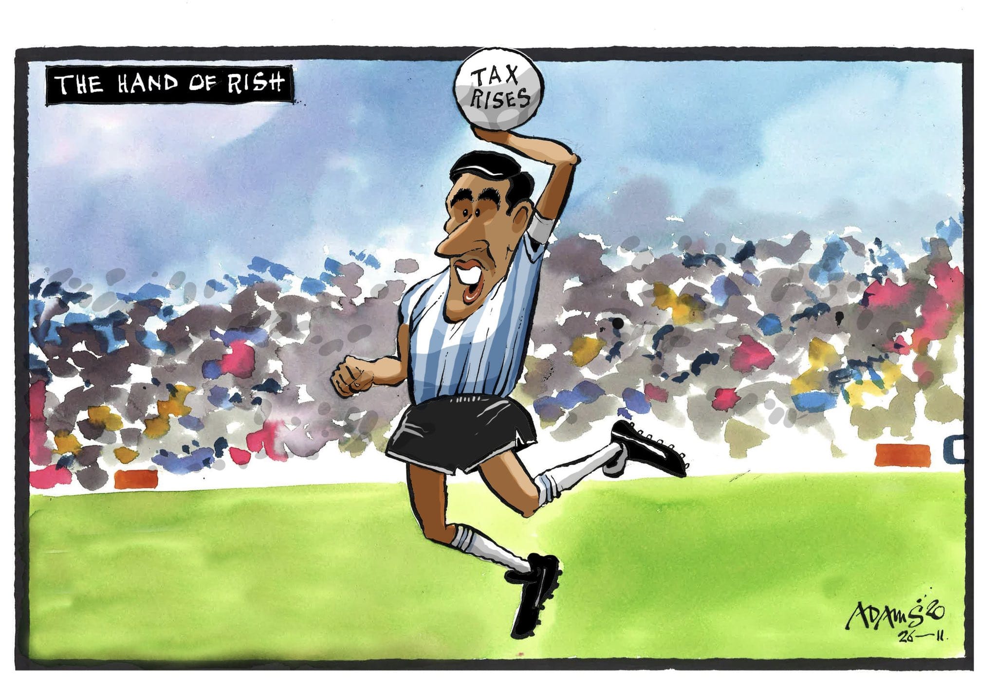Drawing on football legend Diego Maradona’s infamous ‘Hand of God’ goal, Christian Adams takes a jibe at UK Chancellor Rishi Sunak’s new tax raises.