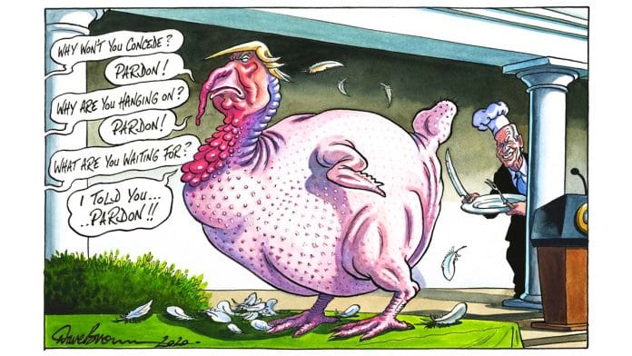 In today’s featured cartoon, Dave Brown’s Thanksgiving-themed take on US President Donald Trump’s refusal to acknowledge his defeat int the 2020 US elections.
