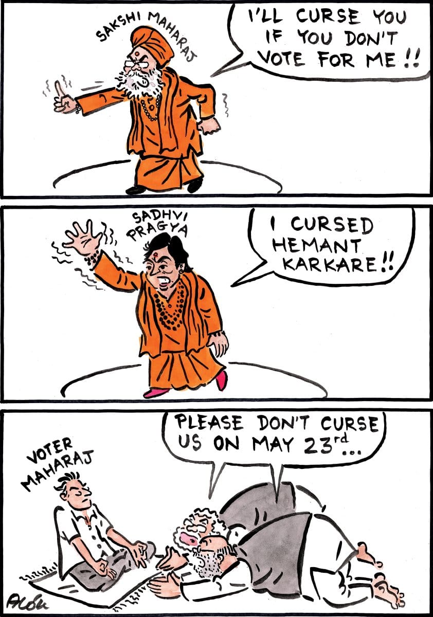 Alok Nirantar pokes fun at BJP Lok Sabha candidates, Sakshi Maharaj and Sadhvi Pragya, over their recent remarks that stirred controversy last week. The cartoonist shows while the duo is on a cursing spree, their party may bear the brunt of the electorate’s curse come 23 May, counting day.