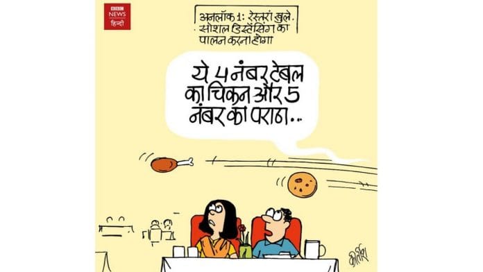 In today’s featured cartoon, Kirtish Bhatt re-imagines what eating in a restaurant would look like in the post-Covid world where physical distancing is the norm.