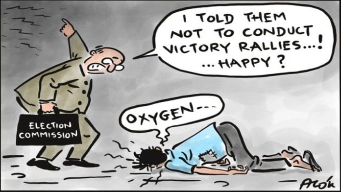 In today’s featured cartoon, Alok Nirantar takes a swipe at the Election Commission’s late decision to ban all victory processions following the assembly election results that will be declared on 2 May.