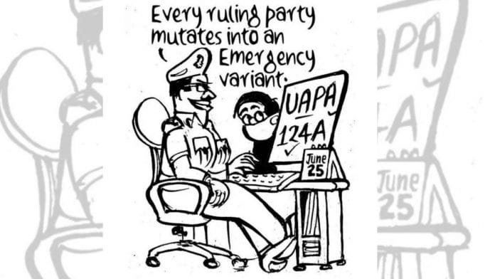 In today’s featured cartoon, on the 46th anniversary of the Emergency, E.P. Unny comments on the parallels between the Emergency and the many people slapped with the stringent anti-terror law, Unlawful Activities Prevention Act (UAPA).