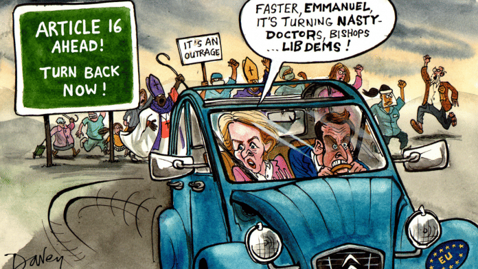 In today’s featured cartoon, political cartoonist Andy Davey illustrates on the European Commission attempting to invoke Article 16 of the Northern Ireland Protocol in order to block the transit of Covid-19 vaccines to the UK, in the face of a shortfall. The bloc later revoked its decision.