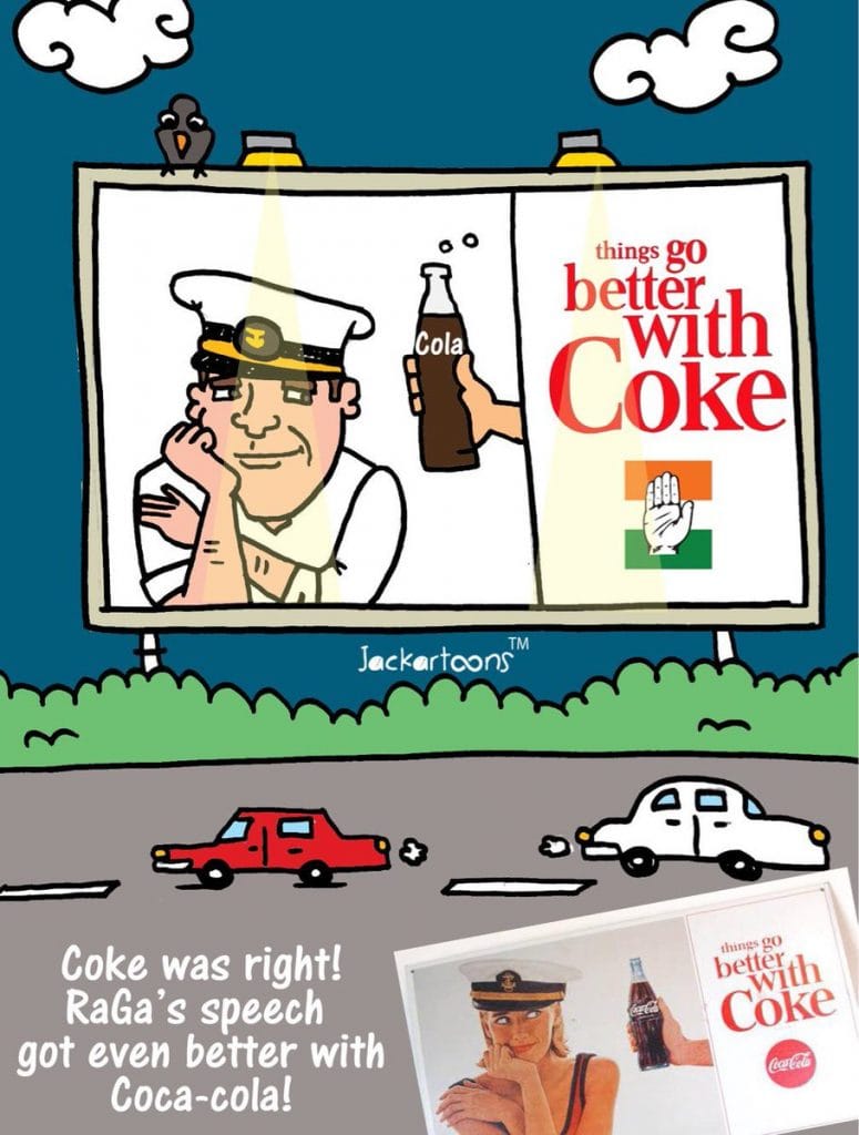 Cartoonist Sanket Jack mocks Congress president Rahul Gandhi’s statement that Coca Cola’s founder was once a “shikanji wala (lemonade seller)”, by reimagining an old ad for the beverage.