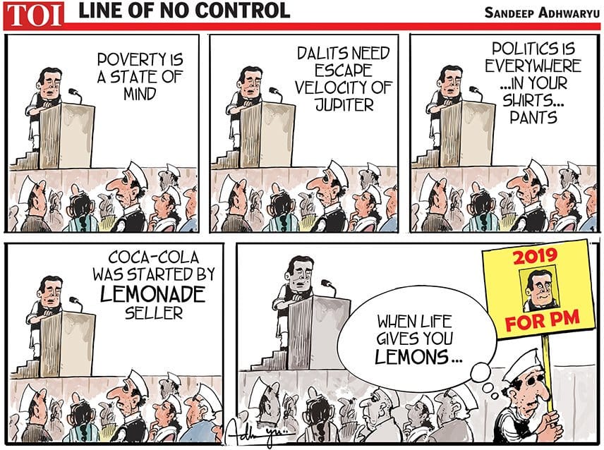 Sandeep Adhwaryu, in The Times of India, takes a dig at Rahul’s many controversial statements over the years. “When life gives you lemons…”