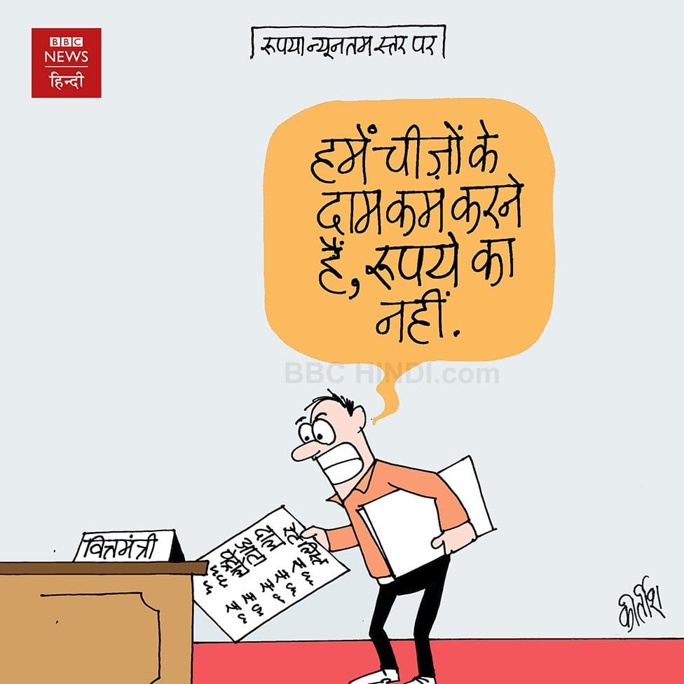Cartoonist Kirtish Bhatt of BBC Hindi weighs in on the falling rupee, saying Indians wanted costs to fall, not the value of the Indian currency. Rupee dropped to an unprecedented 71/$ this Friday.