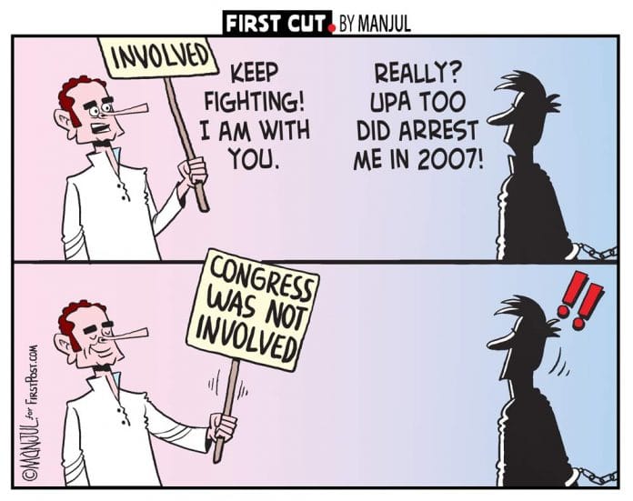 Cartoonist Manjul draws on the allegations of hypocrisy levelled at the Congress for supporting the five activists arrested for alleged Maoist links this week.