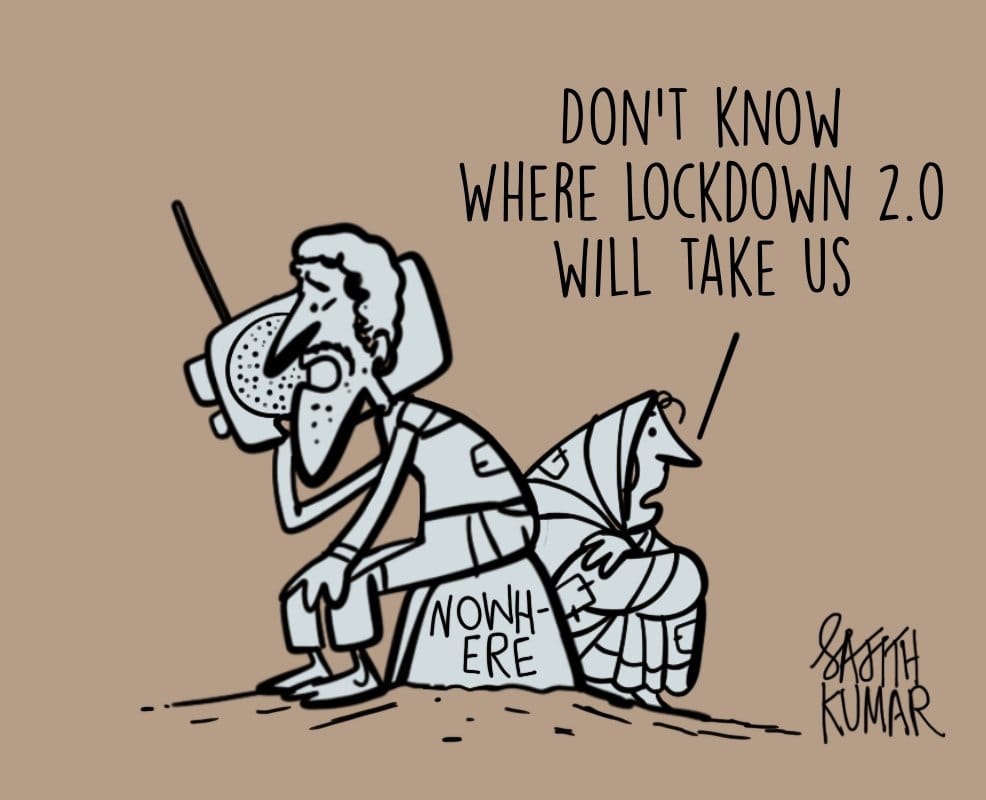 Sajith Kumar illustrates the plight of the migrants who are still reeling from the first lockdown and have nowhere to go even now.