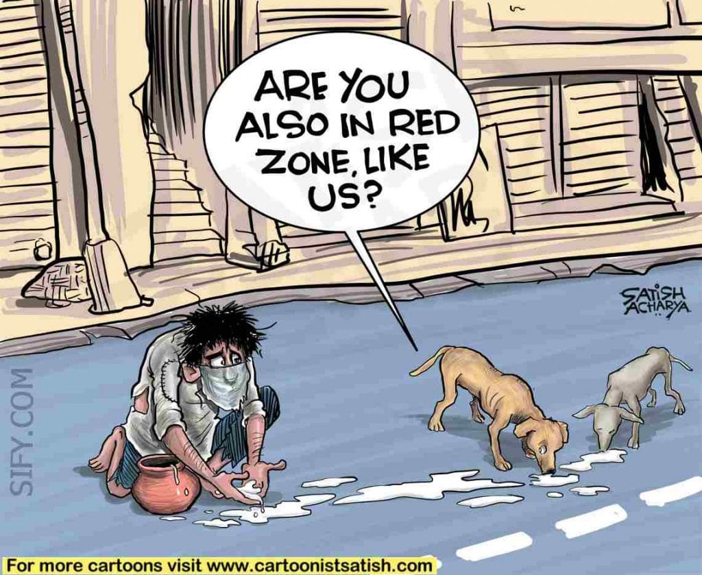 Satish Acharya depicts the heart-wrenching video of a man trying to collect milk which was spilt on the road while stray dogs were also drinking it. He comments that there are, perhaps, different kinds of red zones.