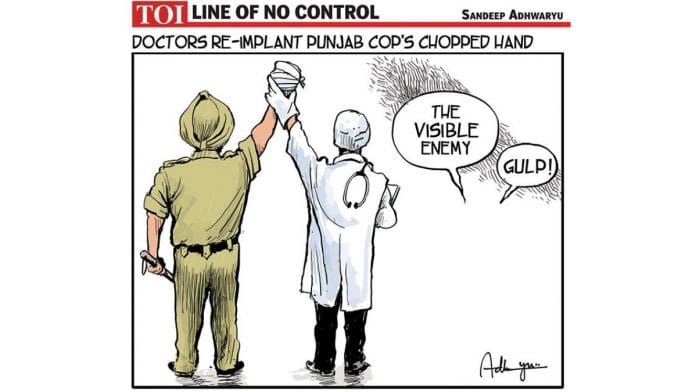 In today’s featured cartoon, Sandeep Adhwaryu celebrates doctors re-attaching the severed wrist of the policeman who was attacked by the Nihang community in Punjab.