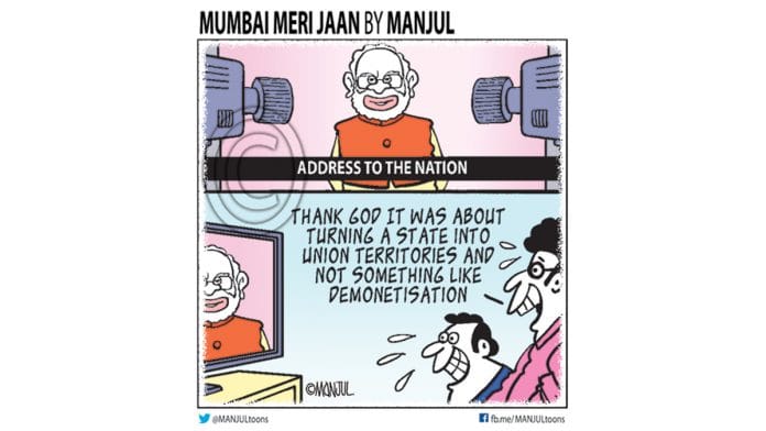 In today’s featured cartoon, Manjul alludes to Prime Minister Narendra Modi’s announcement of ‘demonetisation’ on the night of 8 November, 2016 after Modi ‘addressed the nation’ once more Thursday to talk about the government’s motion of abrogating Article 370.