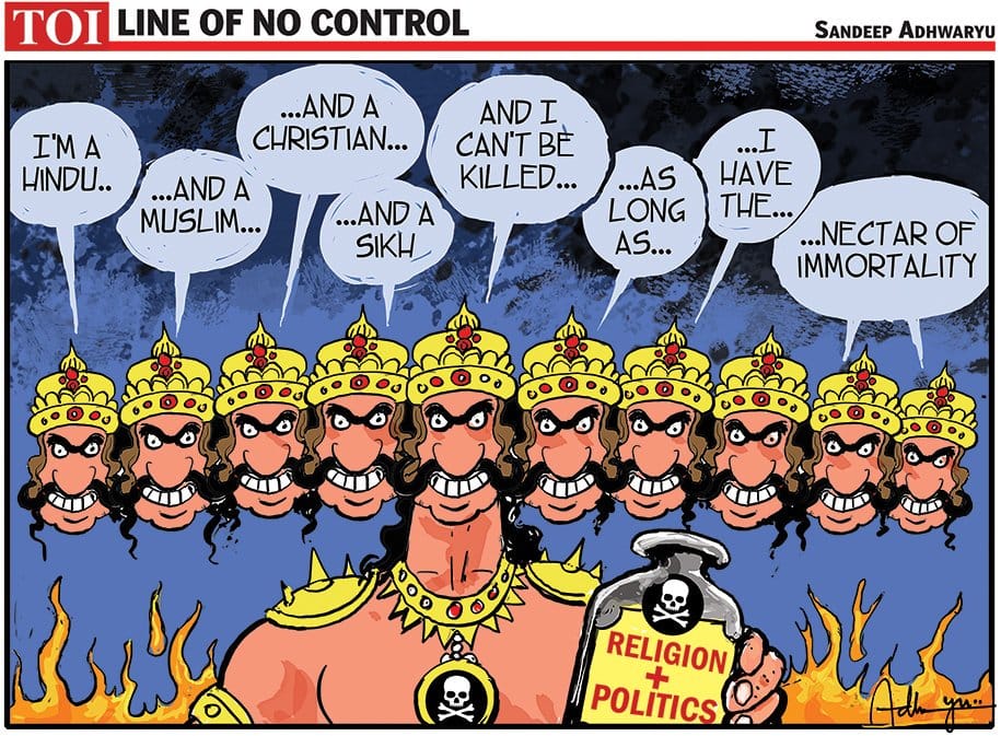 Sandeep Adhwaryu makes a point on Dussehra to comment on how the combination of religion and politics is the perfect elixir to keep ‘Ravana’ alive forever.