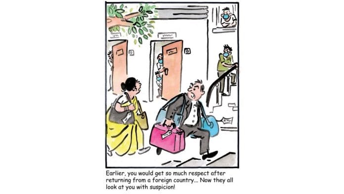 In today’s featured cartoon, Alok Nirantar finds irony in society’s way of looking at a ‘foreign returned’ Indian before and during the coronavirus pandemic.