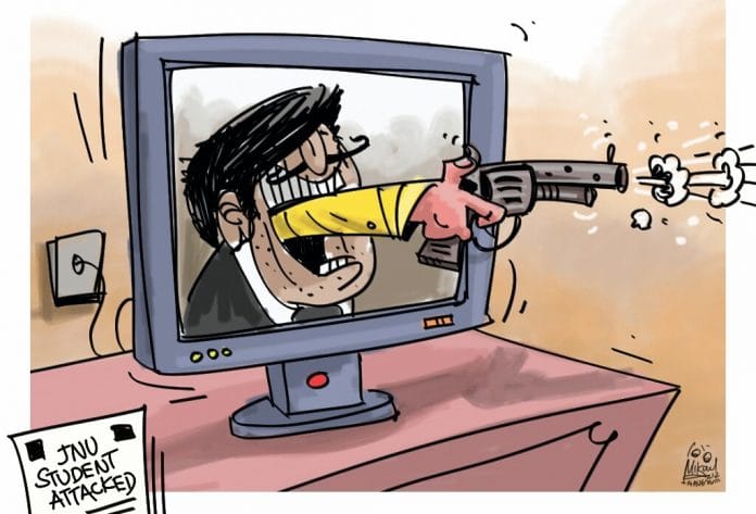 Umar Khalid in a Facebook post Wednesday said that the real culprits are the prime time anchors and TV channels which branded him as anti-national. Gokul Gopalakrishnan illustrates broadcast media shooting a bullet at him depicting a media trial gone wrong.