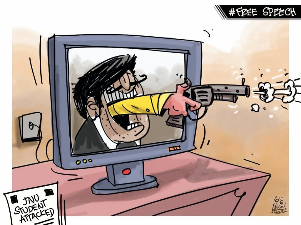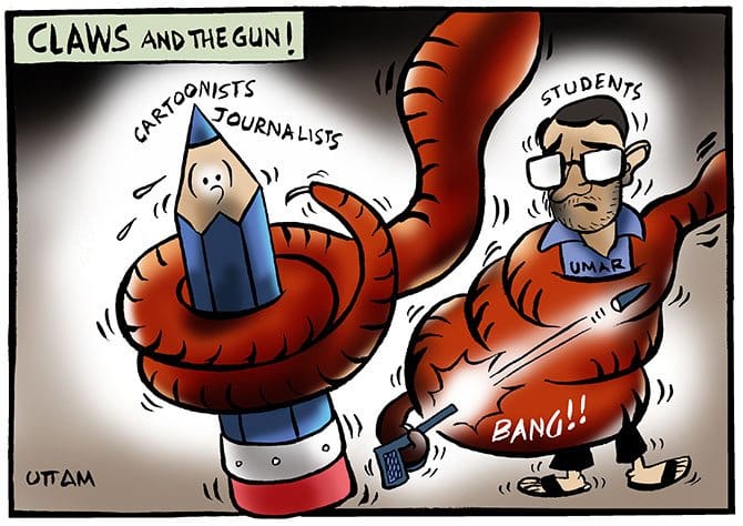 Cartoonist Uttam illustrates how freedom of the press is in danger and the attack on student-activist Umar Khalid in Delhi Monday. Former Mail Today cartoonist Satish Acharya quit his position after editor Dwaipayan Bose rejected his cartoon and replaced it with a photo. The cartoon depicted China’s rising influence over South Asia.