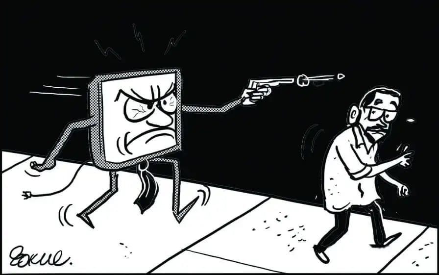 Cartoonist Mika Aziz illustrates Umar Khalid being attacked by the broadcast media depicting how prime-time debate created hatred against him.