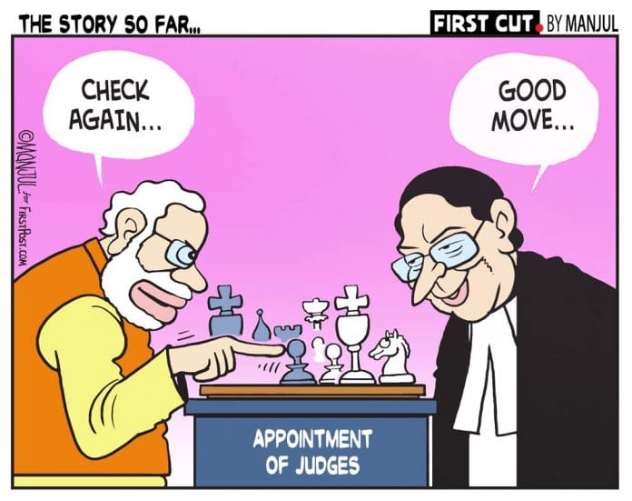 The lead cartoon by Manjul for FirstPost highlights the game of chess being played by the government and the judiciary over the appointment of judges. The five-member Supreme Court collegium will be looking into law minister Ravi Shankar Prasad’s recommendation about elevating Justice K.M. Joseph again Wednesday.