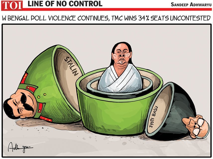 Sandeep Adhwaryu in Times of India highlights the continuing violence in West Bengal during the panchayat elections. Many claimed that goons from the Trinamool Congress did not allow other party candidates to file their nominations. Adhwaryu suggests that Banerjee is no different from the earlier autocratic CPI(M).
